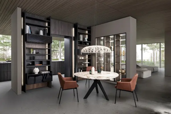 Trendy kitchen design blending classic timber coziness with sleek gloss coatings and pale marble textures.