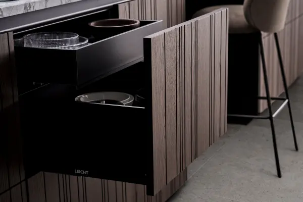 Hidden drawers keep things tidy and are easy to use in modern kitchens.