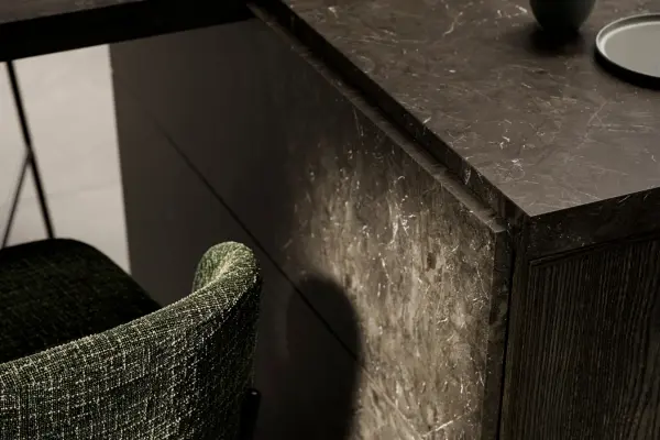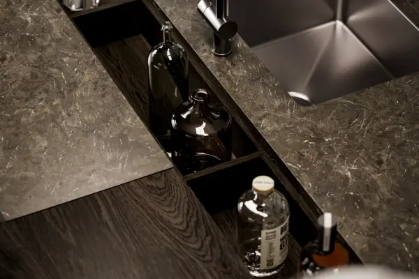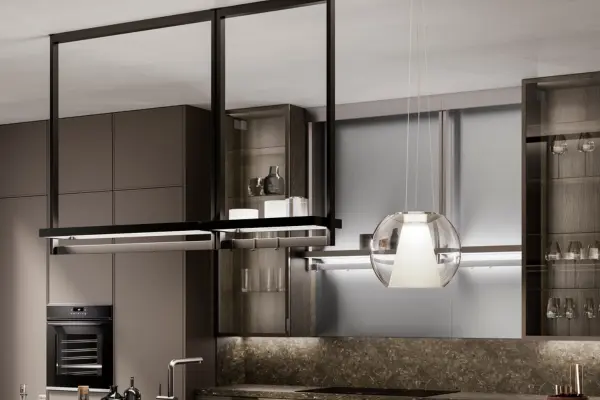 A premium kitchen that combines smooth satin finishes with metallic accents for an elegant, contemporary space.